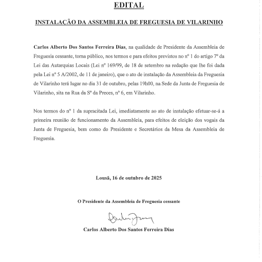 Published 17 Outubro, 2025 Edital – Instalação da Assembleia de Freguesia de Vilarinho VER VERSÃO PDF